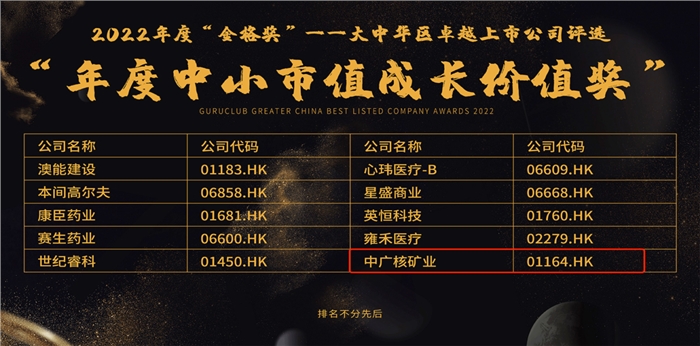 本次獲獎顯示出市場及投資者對安軍靖先生及中廣核礦業在資本市場上的突出表現所給予的充分肯定和高度評價,同時也凸顯了資本市場對天然鈾行業前景及公司潛力的極大認可。中廣核礦業將持續耕耘,繼續致力于推動行業發展,優化社會環境治理及可持續發展,努力開拓市場,不斷提升企業價值,用更加優異的成績回報各位股東。