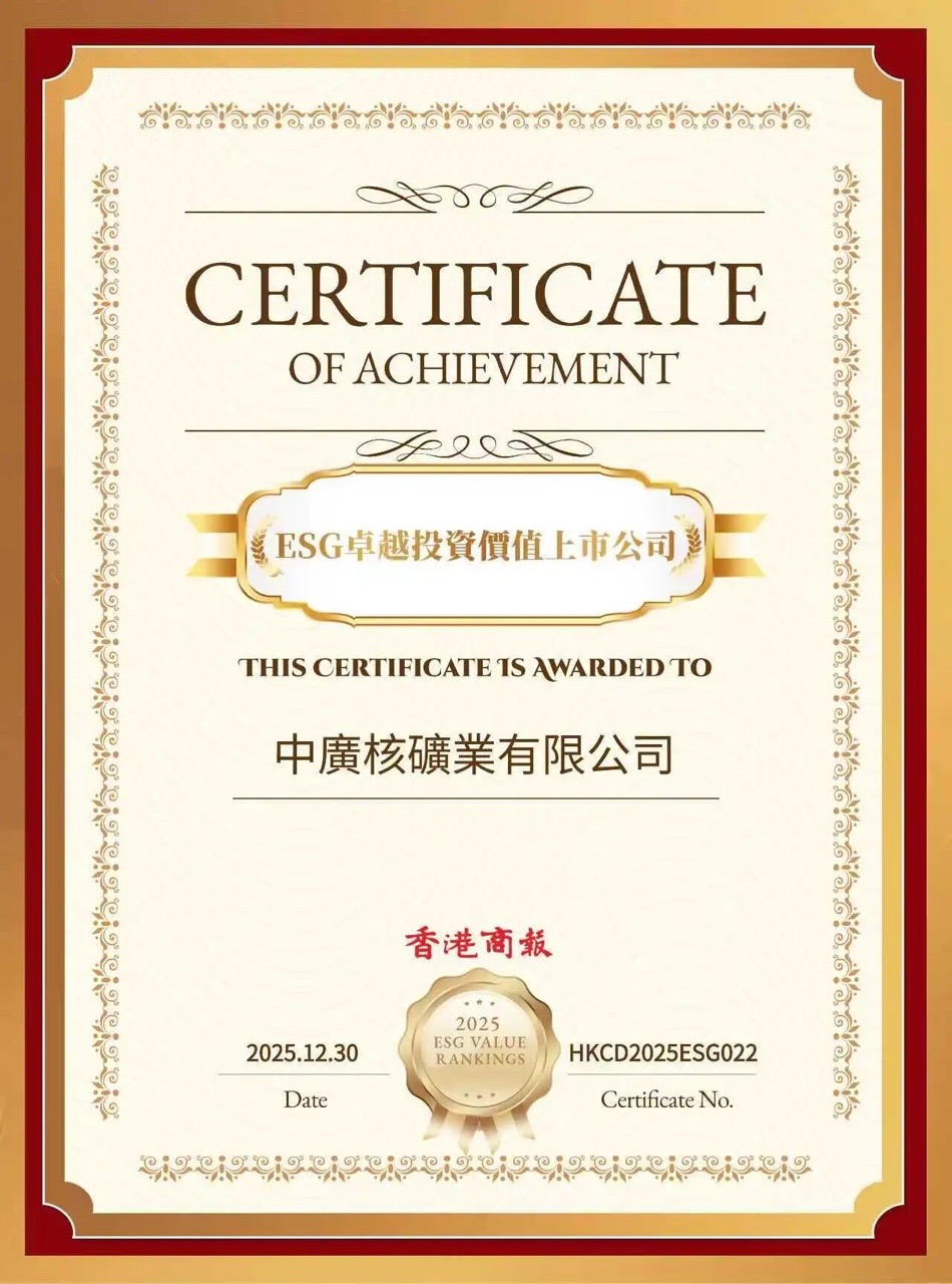 日前,由《香港商報》主辦的“2025年度上市公司卓越ESG價值榜”頒獎典禮在香港灣仔隆重舉行。中廣核礦業憑借在環境、社會與管治(ESG)領域的優異表現,獲評“ESG卓越投資價值上市公司”。本屆評選由《香港商報》聯合專業機構發起,旨在挖掘港股市場中積極履行社會責任、具備長期增長潛力的標桿企業。香港特區政府、金融監管機構、資本市場專家及相關行業代表出席活動,為獲獎企業頒發證書。此次獲評“ESG卓越投資價值上市公司”獎項,不僅是權威媒體對中廣核礦業ESG治理水平的認可,更是對其投關價值與ESG實踐深度融合的肯定。