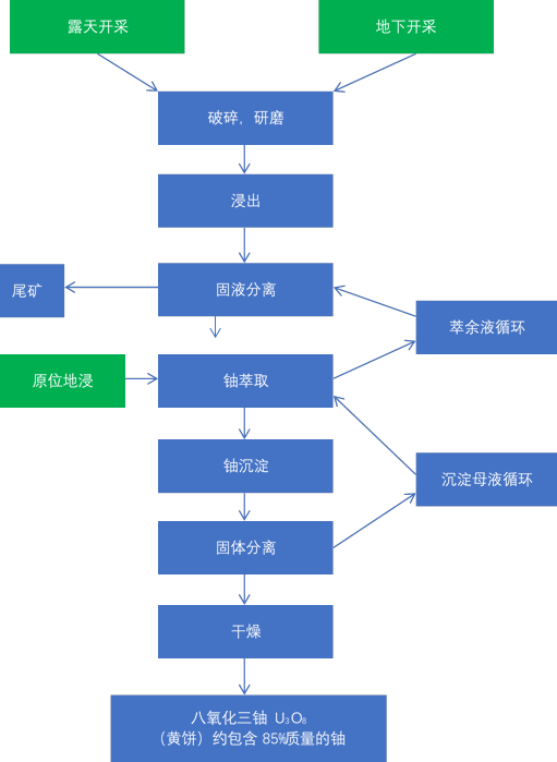 世界主要鈾礦的開采方式包括三種:原位地浸開采,露天開采及地下開采。世界約48%的天然鈾通過原位地浸開采生產出來,46%來自于常規開采方法(露天開采及地下開采)生產出來,6%作為其他礦產品副產品采出。